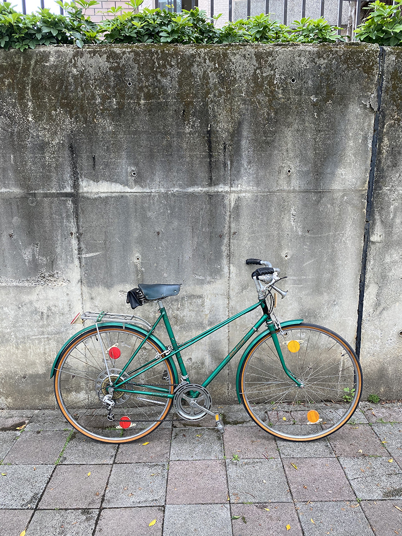 mixte還有一特別處就是後剎車採用吊剎,順著兩細管的中間走線方式顯得十分俐落,變速撥桿安置在龍頭處方便操作。前後輪使用黃邊胎作黃綠撞色的色彩計畫。原本貨架上有一個很有特色的大型反光片,當時也花費不少時間終於找到同樣白底的紅黃各一對的老cateye反光片安裝在前後輪上作呼應。最後裝了一個小坐墊包來收納這台車的小備用零件。整車組好後自己覺得外觀看起來頗有靈氣,不愧對它叫作『sprite』精靈這個名字。