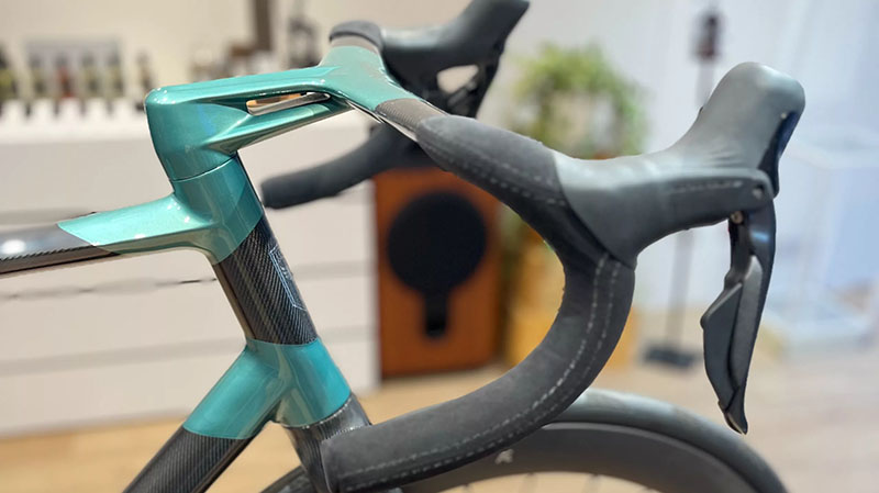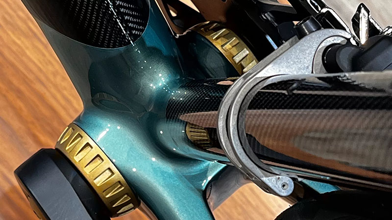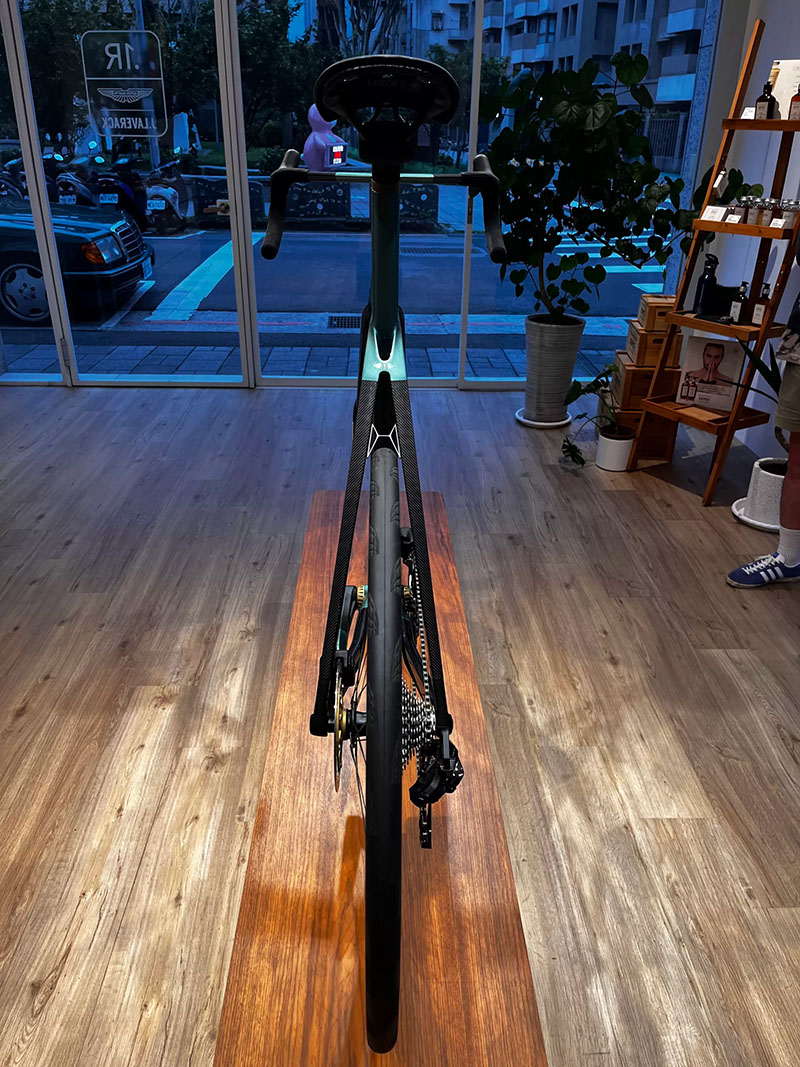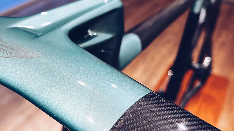 順著他手指的地方看去,本以為只是綠色塗裝的部分,竟是鈦合金跟碳纖維的接合處!我對於碳纖維加鈦合金的複合式車架形式非常痴迷,如果要再擁有下一台公路車,那絕對就會是這種,但Aston Martin這台車的外觀,從外觀看不出任何接合破綻,跟我所認知的複合式材質車架完全不同!