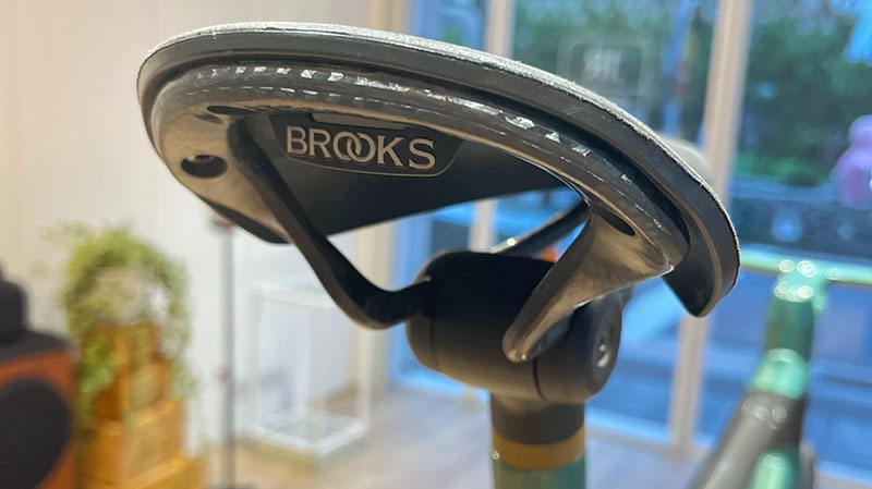 車架的眼睛-輪組:大偉說AM嘗試裝上了Lightweight以及許多其他的品牌,但總覺得風格不對,最後還是找來了英國的花鼓與輪框品牌重新編輪,不讓輪組搶掉整車的風采。而坐墊也是請老牌的英國知名坐墊Brooks操刀,製作了一個碳纖複合材質的坐墊,表面呈現了類似人造麂皮的材質樣式。
