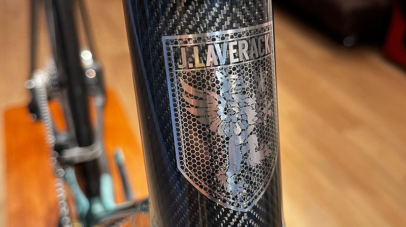 車架的靈魂-頭管標:在看頭標的時候我一直覺得這個貼紙有些許的立體感,像是藏在了精油層之下,於是問了大偉。他說他原本也以為這是貼紙,因為線條非常的細緻,AM跟他說明這是用鈦合金蝕刻片製作的,由於非常的薄,因此每次製作完都需要急速冷凍,不然會斷裂。
